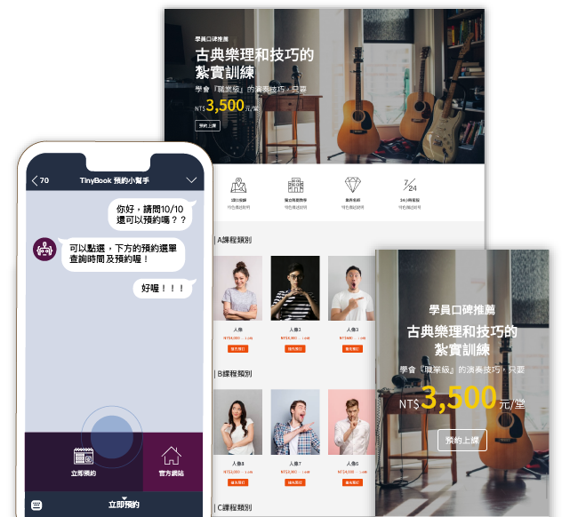 服務方案 為您量身訂做最適合的方案 優惠 一頁式預約 原價 NT$19,800 NT$ 17,760 年繳 ( 現省2,040 ) 快速開站 | 行動預約 免費體驗 優惠 品牌預約 原價 NT$28,800 NT$ 26,400 年繳 ( 現省2,400 ) 群發EDM、CRM會員經營 免費體驗 優惠 社群預約 原價 NT$44,160 NT$ 38,400 年繳 ( 現省5,760 ) 會員分級優惠、紅利累積、部落格 免費體驗